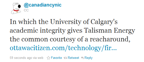 When a university takes money from an oil company to build skepticism for climate change, you not only have a dishonest higher educational body but also one that goes against everything that is sacred about the pursuit of knowledge. It becomes one big Con of a PR firm, you know like the Fraser Institute. Plus, it stinks to high heaven.